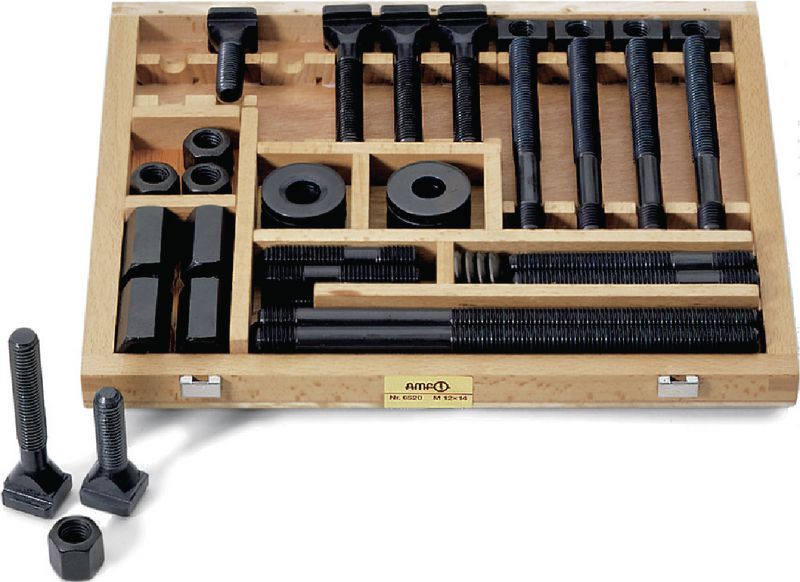M14 x 16 mm: M18 x 20 enthält anstelle der Nutenschraube DIN 787 zusätzlich vier Stiftschrauben DIN 6379, 125 mm und zwei Stück 80 mm, je mit Mutter für T-Nuten DIN 508 und Scheiben DIN 6340.