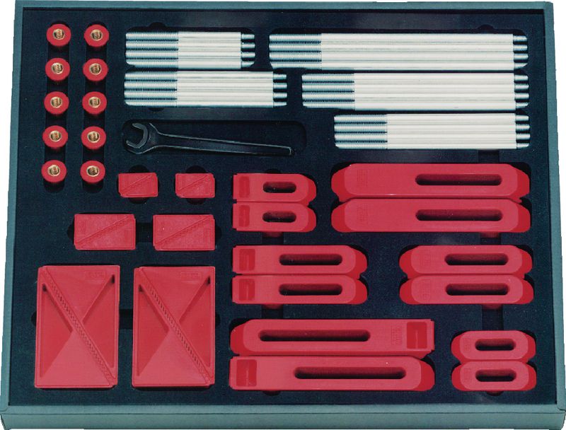 Spannpratzen, -unterlagen und Muttern: Aus hochfestem Kunststoff (PBT). Stiftschrauben: Aluminium eloxiert.