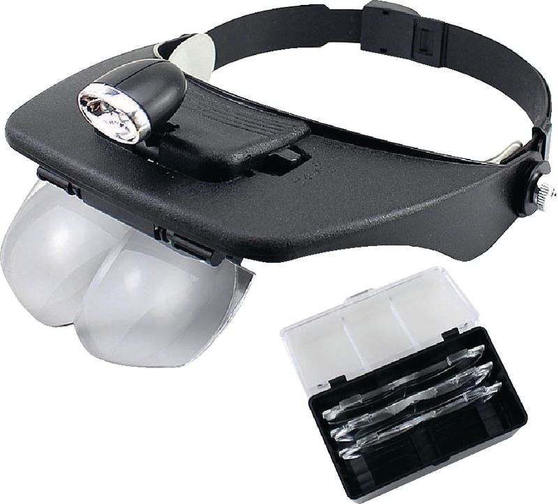 mit eingebauter Beleuchtung. Kopfband leicht regulierbar. Verstellbare Linsenfassung. Auswechseln der Linsen durch Einklicken.