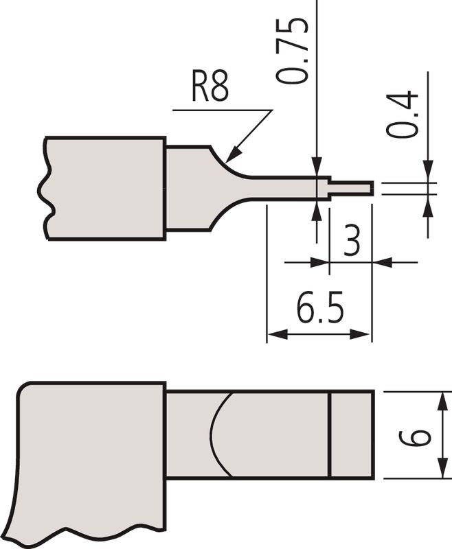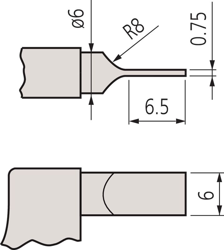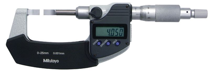 nichtdrehender Spindel zum Messen von Aussennuten. Skalentrommel und Skalenhülse mattverchromt. Messflächen geschliffen und feinstgeläppt.