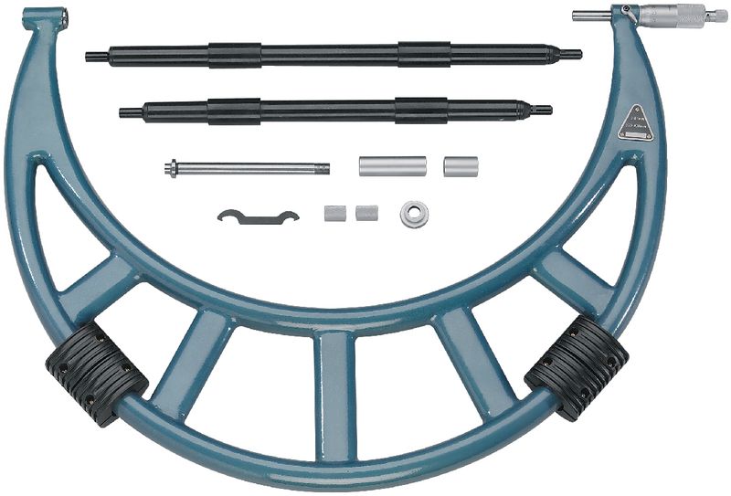 Mit auswechselbarem Messamboss für einen variablen Messbereich. Leichte Bügelkonstruktion (ab 300 mm), blau lackiert mit Gefühlsratsche und Klemmeinrichtung. Skalentrommel und Skalenhülse mattverchromt. Messflächen mit Hartmetall bestückt, geschliffen und feinstgeläppt.