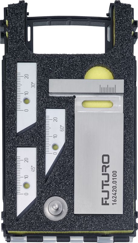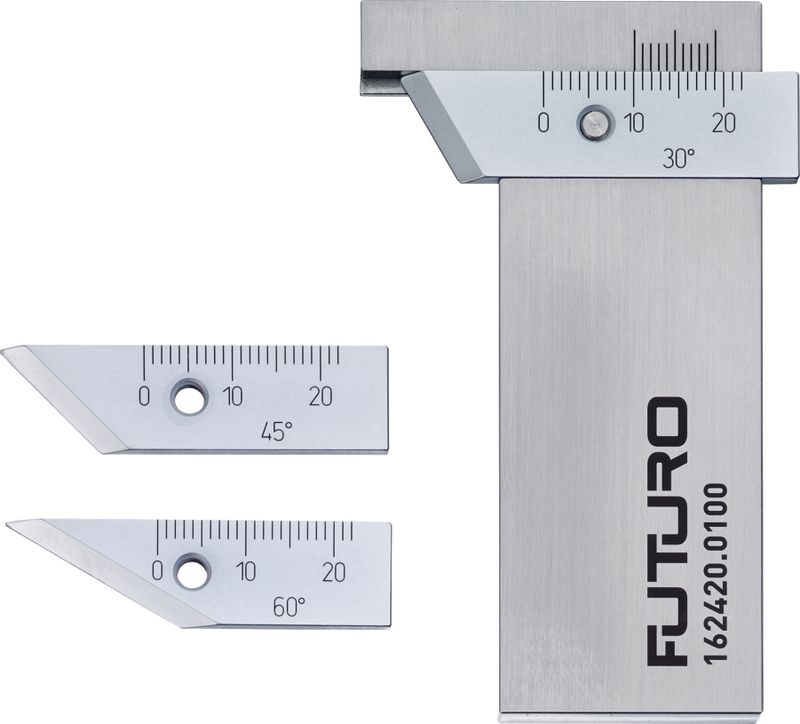 Zum einfachen und exakten masslichen Überprüfen von Anfasungen. Auswechselbare Prüflineale für 30°, 45° und 60° Fasen.