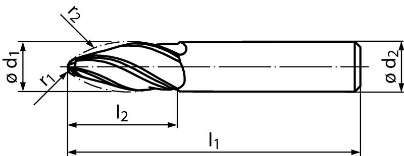3538L, Typ N, Tropfenform, VHM, Ø 6-16 mm, ALCRONA-Beschichtung, Drallwinkel 30°, Zylindrisch (ohne Fläche, HA), Anzahl Zähne 3-4, DIN 6535, HSC