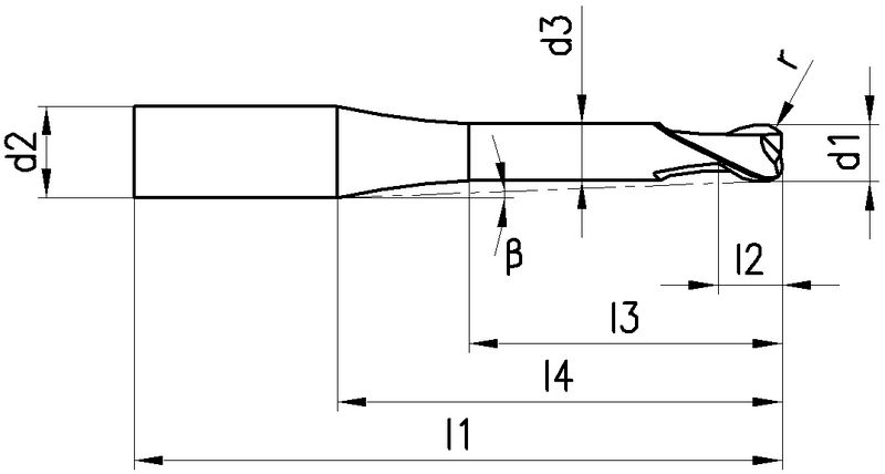 2807A, Typ H, K3-15FH, VHM, Ø 0.5-6 mm, TiAlN-Beschichtung, Drallwinkel 30°, Spanwinkel -3°, Schneidentoleranz ± 0.01, Zylindrisch (ohne Fläche, HA), Schafttoleranz h5, extralang, , mit Eckenradius, Anzahl Zähne 2, Werksnorm
