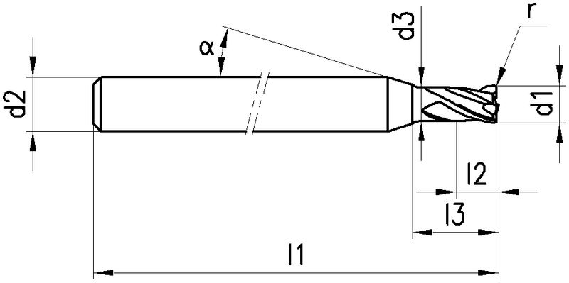 Anwendung: Eck- & Nutenfräser mit Eckradius einsetzbar bis 58 HRC. Geeignet für Nichteisenmetalle und gehärtete Stähle. Toleranzen d1: 0.8 mm...5 mm: +0/-0.010 mm 6 mm...12 mm: -0.005/-0.015 mm