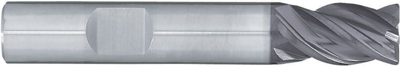Typ HPC, Hartmetall höchster Qualität, VHM, Ø 3-16 mm, AlTiN-Beschichtung, Drallwinkel 37°, Spanwinkel 6°, Schneidentoleranz 0 / - 0.03, Weldon (mit Fläche, HB), Schafttoleranz h6, mittellang, Zentrumschnitt, ungleiche Teilung, mit Eckenradius, Anzahl Zähne 4, Werksnorm, HPC