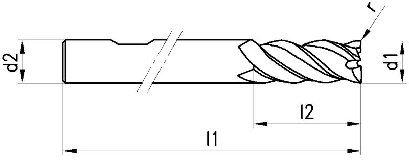 VHM, Ø 6-20 mm, beschichtet, ungleicher Drallwinkel 44/45°, Schneidentoleranz 0 / - 0.03, Weldon (mit Fläche, HB), Schafttoleranz h6, mittellang, Zentrumschnitt, mit Eckenradius, Anzahl Zähne 4-5, Werksnorm, HPC