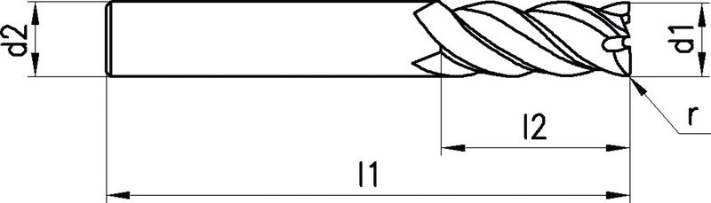 Typ W, VHM, Ø 3-16 mm, polierte Spannuten, Drallwinkel 45°, Zylindrisch (ohne Fläche, HA), lang, Zentrumschnitt, mit Eckenradius, Anzahl Zähne 3, Werksnorm