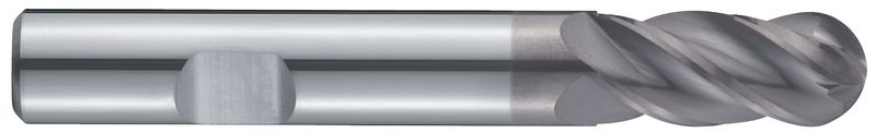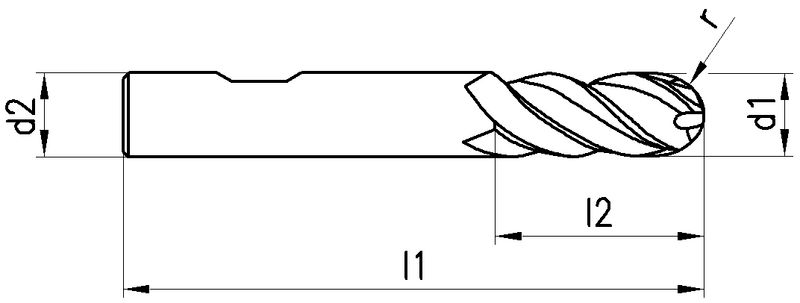 VHM, Ø 3-12 mm, TiAlN-Beschichtung, ungleicher Drallwinkel 35/38°, Spanwinkel 6°, Schneidentoleranz h10, Weldon (mit Fläche, HB), Schafttoleranz h6, lang, Zentrumschnitt, ungleiche Teilung, mit Vollradius, Anzahl Zähne 4, DIN 6527L