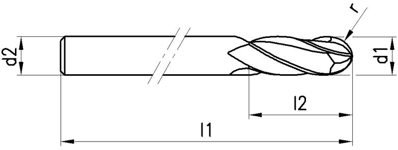 Typ N, VHM, Ø 1-10 mm, TiAlN-Beschichtung, Drallwinkel 30°, Spanwinkel 9°, Zylindrisch (ohne Fläche, HA), Schafttoleranz h6, lang, Zentrumschnitt, mit Vollradius, Anzahl Zähne 4, Werksnorm