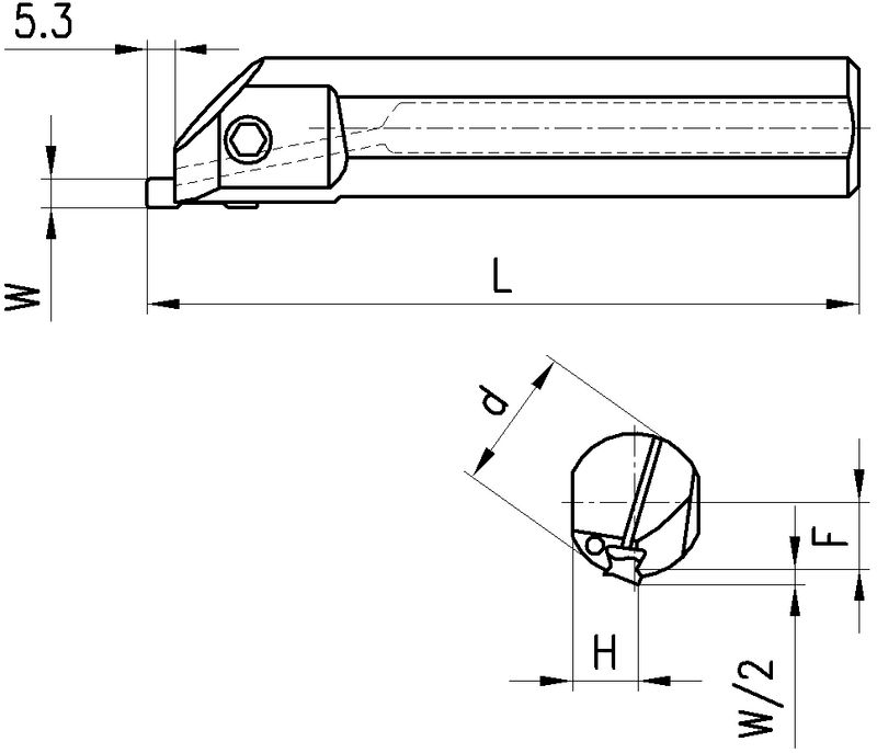 M-Typ, Innenkühlung. Der Durchmesser für den ersten Einstich wird von der Schneideneinsatzgeometrie begrenzt. Nach dem ersten Einstich keine Begrenzung beim Axial-Auskammern nach aussen oder zur Mitte.