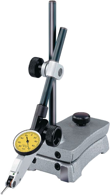 Gusssockel geschliffen, frontale Anschlagfläche, Säule und Arm aus gehärtetem Stahl, Aufnahme für Schwalbenschwanz, Rundspannung oder Öse. Spielfreie Feineinstellung über Blattfeder.