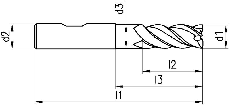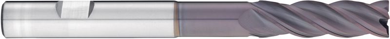 VHM, Ø 6-20 mm, TiAlN-Beschichtung, ungleicher Drallwinkel 35/38°, Schneidentoleranz h10, Weldon (mit Fläche, HB), Schafttoleranz h6, extralang, Zentrumschnitt, ungleiche Teilung, mit Schutzfase, Anzahl Zähne 4, Werksnorm, HPC
