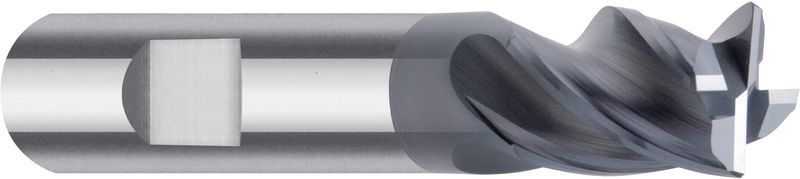 VHM, Ø 3-20 mm, AlTiN-Beschichtung, ungleicher Drallwinkel 35/38°, Schneidentoleranz h10, Weldon (mit Fläche, HB), Schafttoleranz h6, kurz, Zentrumschnitt, ungleiche Teilung, mit Schutzfase, Anzahl Zähne 4, Werksnorm, HPC