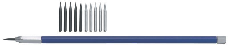 Geliefert mit 12 Ersatzspitzen, die im Schaft aufbewahrt sind.