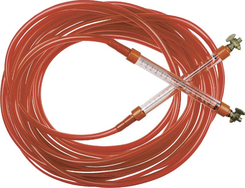 Schlauch-Wasserwaage mit Röhren aus unzerbrechlichem Acrylglas, Skala 0...155 mm, Kunststoff-Armaturen, Messing-Entlüftungshähne mit Dichtungsringen, inklusive Schlauch.