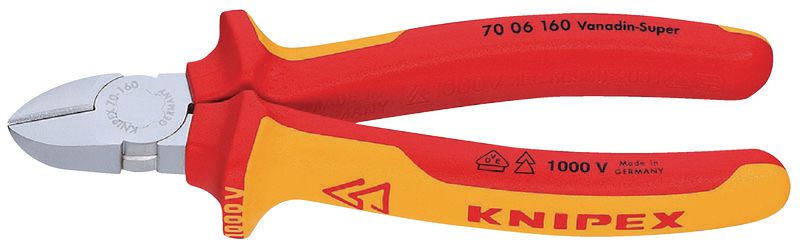 Knipex 7006, Vanadin-Elektrostahl, geschmiedet, ölgehärtet, verchromt. Präzisionsschneiden (Schneidenhärte ca. 62 HRC) für weichen und harten Draht, sauberer Schnitt bei dünnen Cu-Drähten, auch an den Schneidspitzen; schlanke Kopfform, mit Mehrkomponenten-Griffhüllen. 1000V isoliert, VDE geprüft, entsprechend der Norm DIN EN 60900.