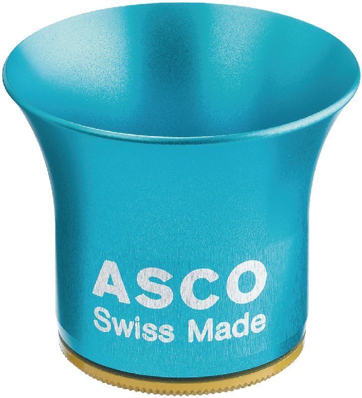 Ausführung in blau eloxiertem Aluminium mit bikonvexer Linse. Angabe der Vergrösserung durch Farbcodierung des Rings.