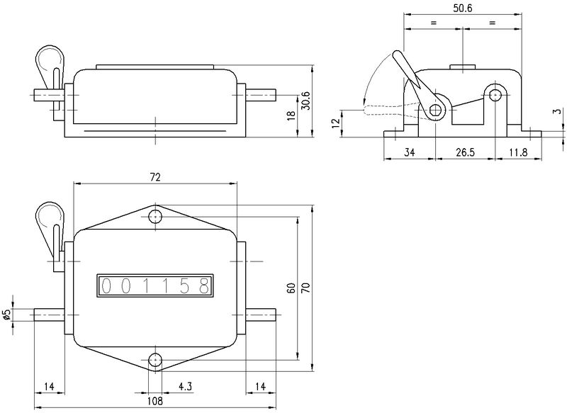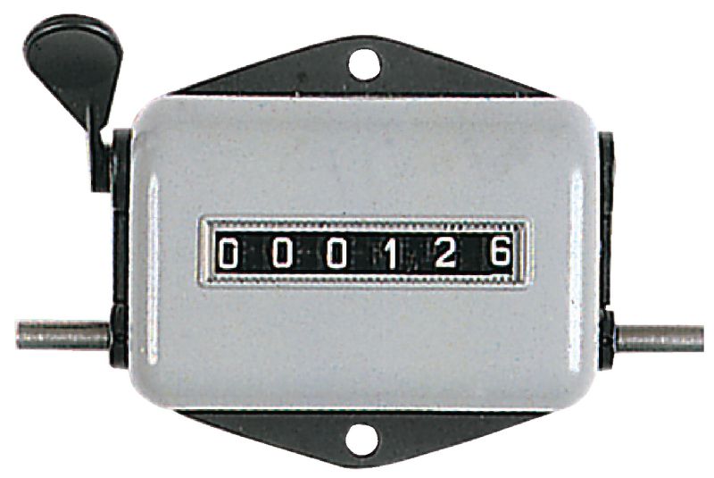 Zur Montage auf Apparate, Nullstellhebel links oder rechts montierbar, addiert und subrahiert eine Ziffer pro Umdrehung. Mit 6 Ziffern, Ziffernhöhe 4.5 mm, max. Drehzahl 2000 Z/min.