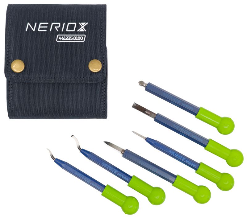 Lieferumfang: 1 x Universal-Entgrater NERIOX mit C-10 Universal-Klinge 1 x Universal-Entgrater NERIOX mit C-101 Klinge für kleine Löcher ab 1.5 mm 1 x Dreikantschaber NERIOX mit Klinge 3 mm 1 x Dreikantschaber NERIOX mit Klinge 6 mm 1 x Blechentgrater mit Klinge V-1 1 x Handsenker 6.3 mm für Lochgrösse 1...6 mm