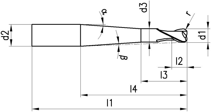 1996A, Typ H, K3-15FH, VHM, Ø 1-12 mm, TiAlN-Beschichtung, Drallwinkel 30°, Spanwinkel -3°, Schneidentoleranz ± 0.01, Zylindrisch (ohne Fläche, HA), Schafttoleranz h5, kurz, Zentrumschnitt, mit Eckenradius, Anzahl Zähne 2, DIN 6535