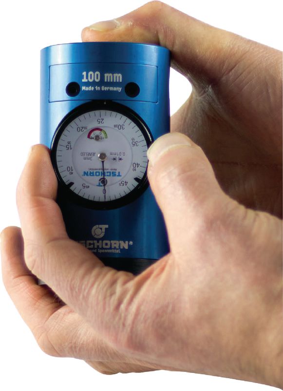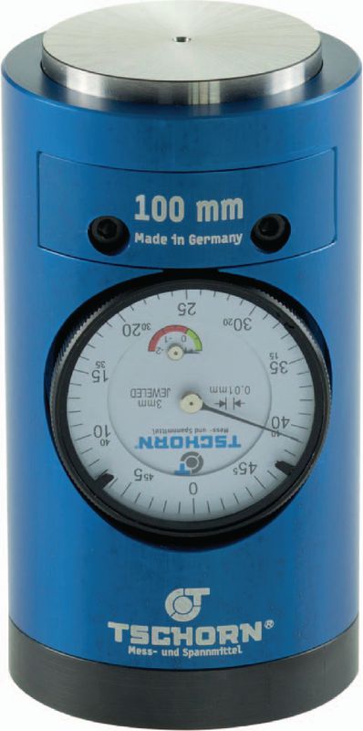 Anwendung: Einfaches Einstellen: Taster eindrücken - kleiner Zeiger auf -2 mm - Skala für großen Zeiger auf 0 drehen - fertig! Das Voreinstellgerät wird auf das Werkstück gestellt. Dann fährt man mit stehendem Werkzeug vorsichtig auf den Taster auf, bis beide Zeiger der Messuhr „0“ anzeigen. Nun ist das Bezugsmass von 100 mm zum Werkstück erreicht. Dank eines Sicherheitsfederwegs macht ein Überfahren von bis zu 2 mm nichts aus.