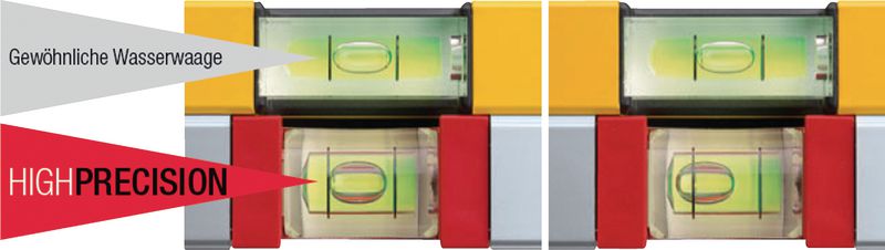 Extrem robustes 4-Kammer-Profil mit stossdämpfenden Gummi-Endkappen. Kantenlose Horizontallibelle für verzerrungsfreie Sicht auf die Libellenblase. Die Libellenblasen machen bei Schräglage einen 5 x weiteren Weg als bei üblichen Wasserwaagen. Ungenauigkeiten werden dadurch schneller sichtbar.