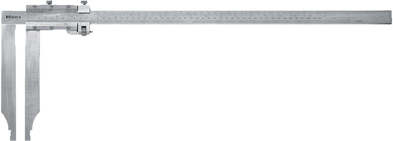 Lange Messschenkel, Feinverstellung, Schiene und Schieber aus gehärtetem, nichtrostendem Stahl. Massstab und Nonius mattverchromt.