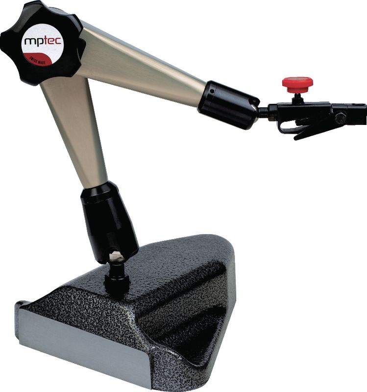 SwissMadeThe stable articulated arms with progressive mechanical clamping guarantee simple, rapid operation. Dial gauge holder for backlash-free adjustment. The sturdy cast base makes the stand good for use on measuring plates.