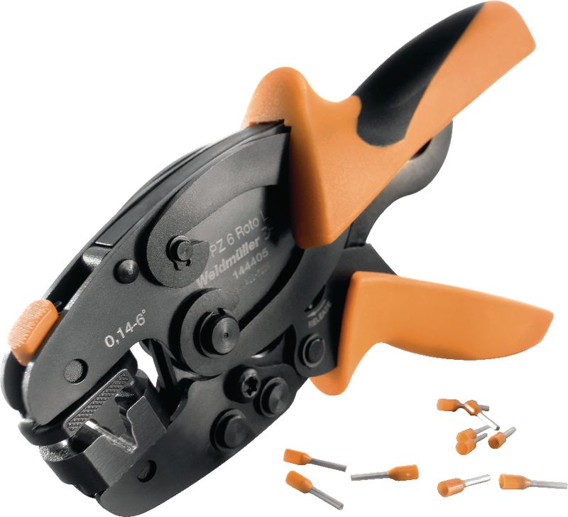 for wire end sleeves with and without plastic collar, ratchet for high-quality crimping, unlocking option, rotatable die allows insertion of the wire end sleeves from in front or from the side. Trapezoidal crimping shape as per DIN 46228 parts 1 and 4.